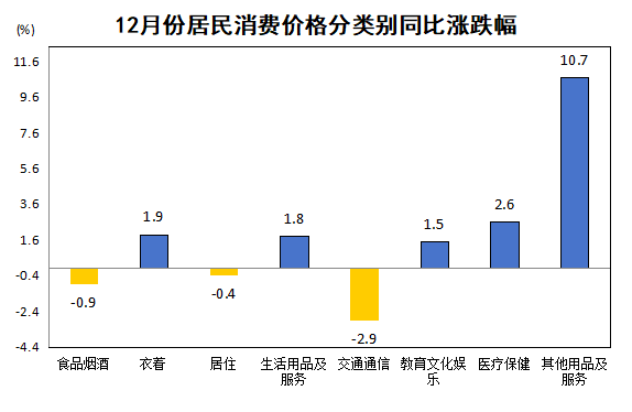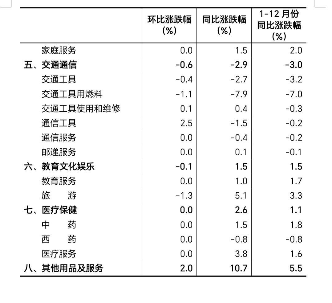 其他七大类价格同比五涨二降。其中,其他用品及服务价格上涨10.7%,医疗保健价格上涨2.6%,衣着价格上涨1.9%,生活用品及服务价格上涨1.8%,教育文化娱乐价格上涨1.5%;交通通信价格下降2.9%,居住价格下降0.4%。