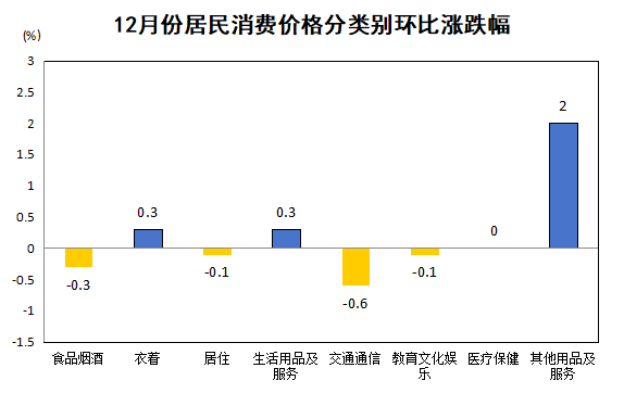 其他七大类价格环比三涨三降一平。其中,其他用品及服务价格上涨2.0%,生活用品及服务价格上涨0.3%,衣着价格上涨0.3%;交通通信价格下降0.6%,教育文化娱乐价格下降0.1%,居住价格下降0.1%;医疗保健价格与上月持平。